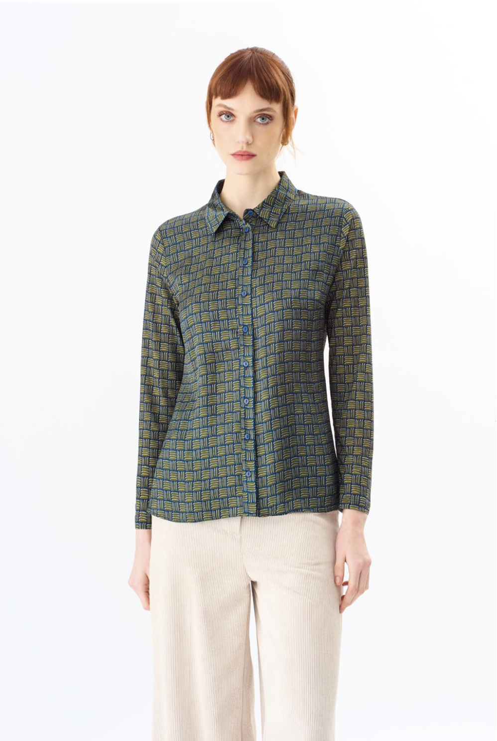 Camicia fluida dalla linea regolare, valorizzata da una stampa geometrica allโover che aggiunge ritmo e personalitร ai look quotidiani. Il design presenta collo a camicia, abbottonatura frontale e maniche lunghe con polsini, mentre il tessuto leggero assicura comfort e caduta pulita per tutto il giorno. Perfetta con denim o pantaloni sartoriali, accompagna con facilitร dallโufficio al tempo libero.