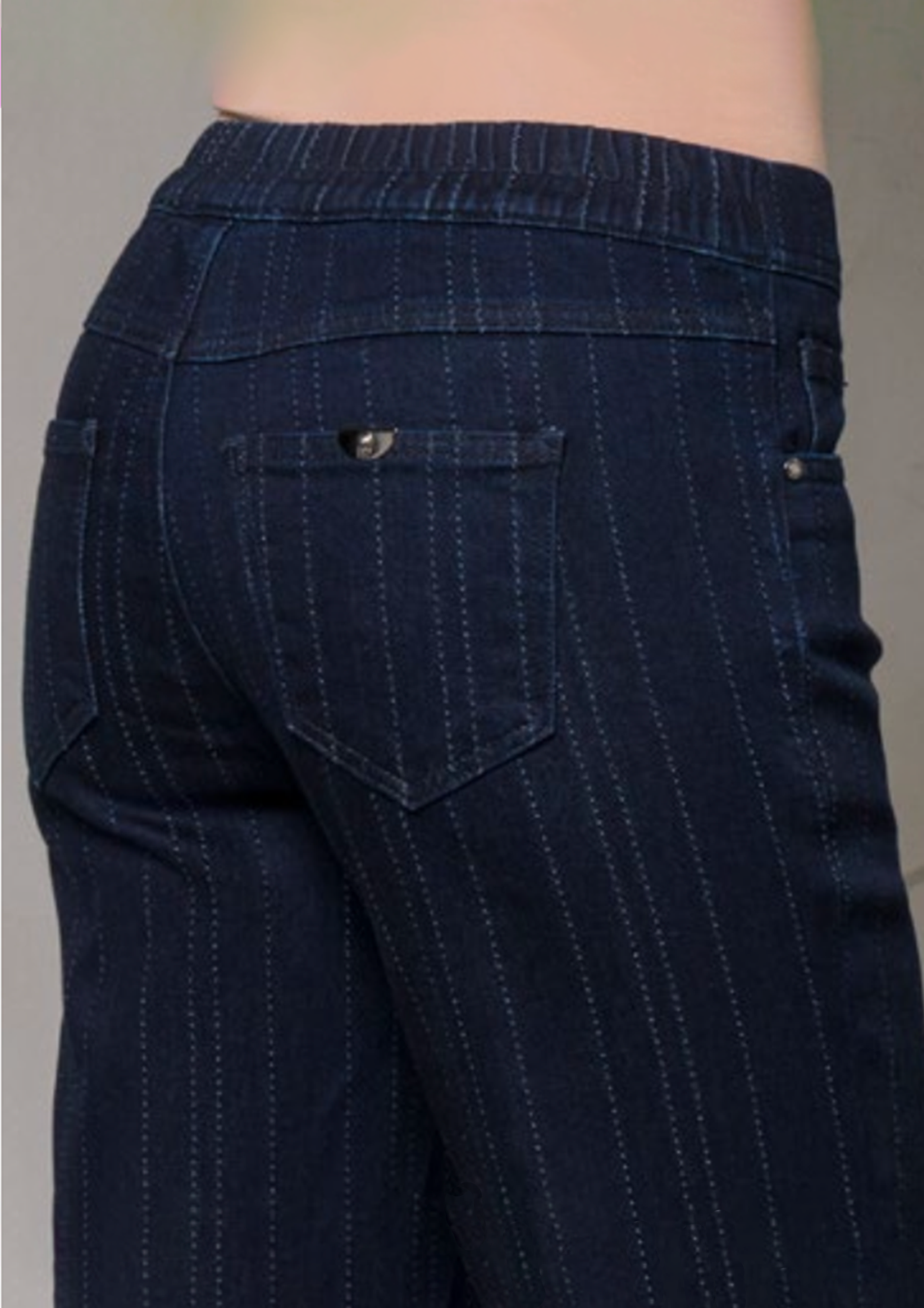 Perché sceglierlo: il gessato verticale lo rende unico, un jeans che unisce praticità ed eleganza, facile da abbinare con camicie o maglioni.