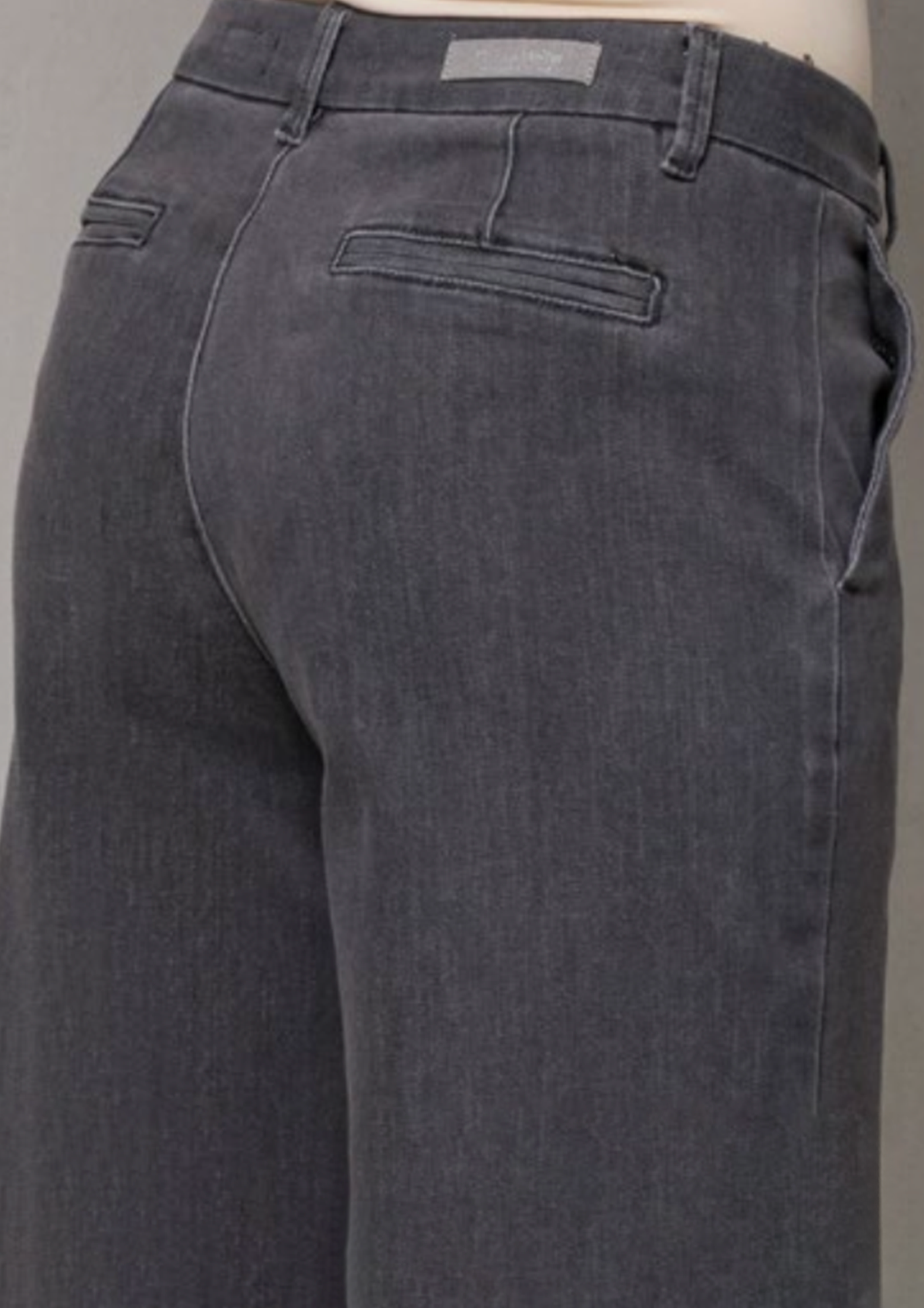 Un jeans sofisticato e versatile firmato Chiara DโAlba, realizzato in denim grigio antracite. Il taglio palazzo a gamba ampia e vita alta offre una vestibilitร confortevole e slanciata, perfetta per outfit moderni e chic. I dettagli delle tasche a filetto posteriori donano eleganza e pulizia al design, mantenendo al contempo praticitร e funzionalitร .
