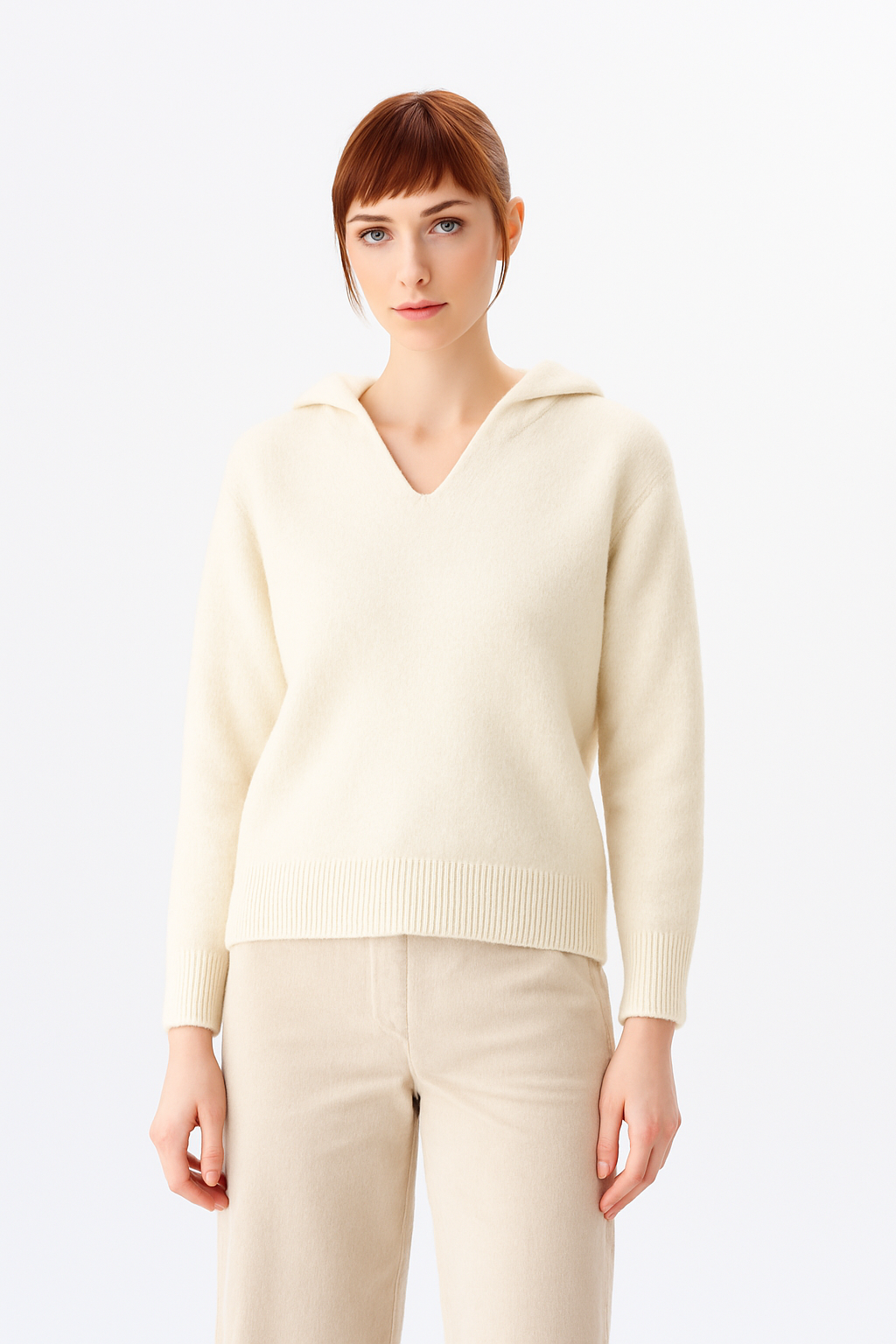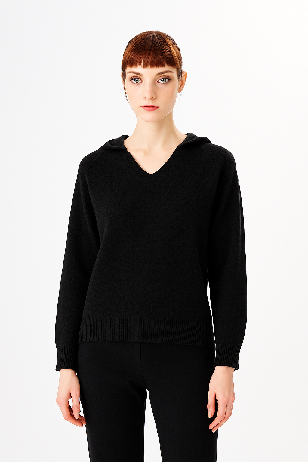 Una maglia essenziale e femminile dalla mano morbida, con linea pulita e rilassata pensata per il comfort quotidiano senza rinunciare allo stile. Il design presenta scollo a V con piccolo cappuccio, costruzione a maniche lunghe raglan e finiture a coste su polsi e fondo, per un look casual-chic facile da abbinare. Perfetta con denim, pantaloni sartoriali o gonne midi per outfit versatili dal giorno alla sera.