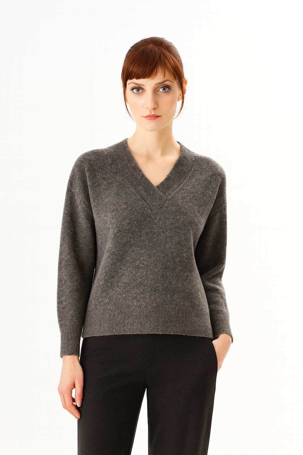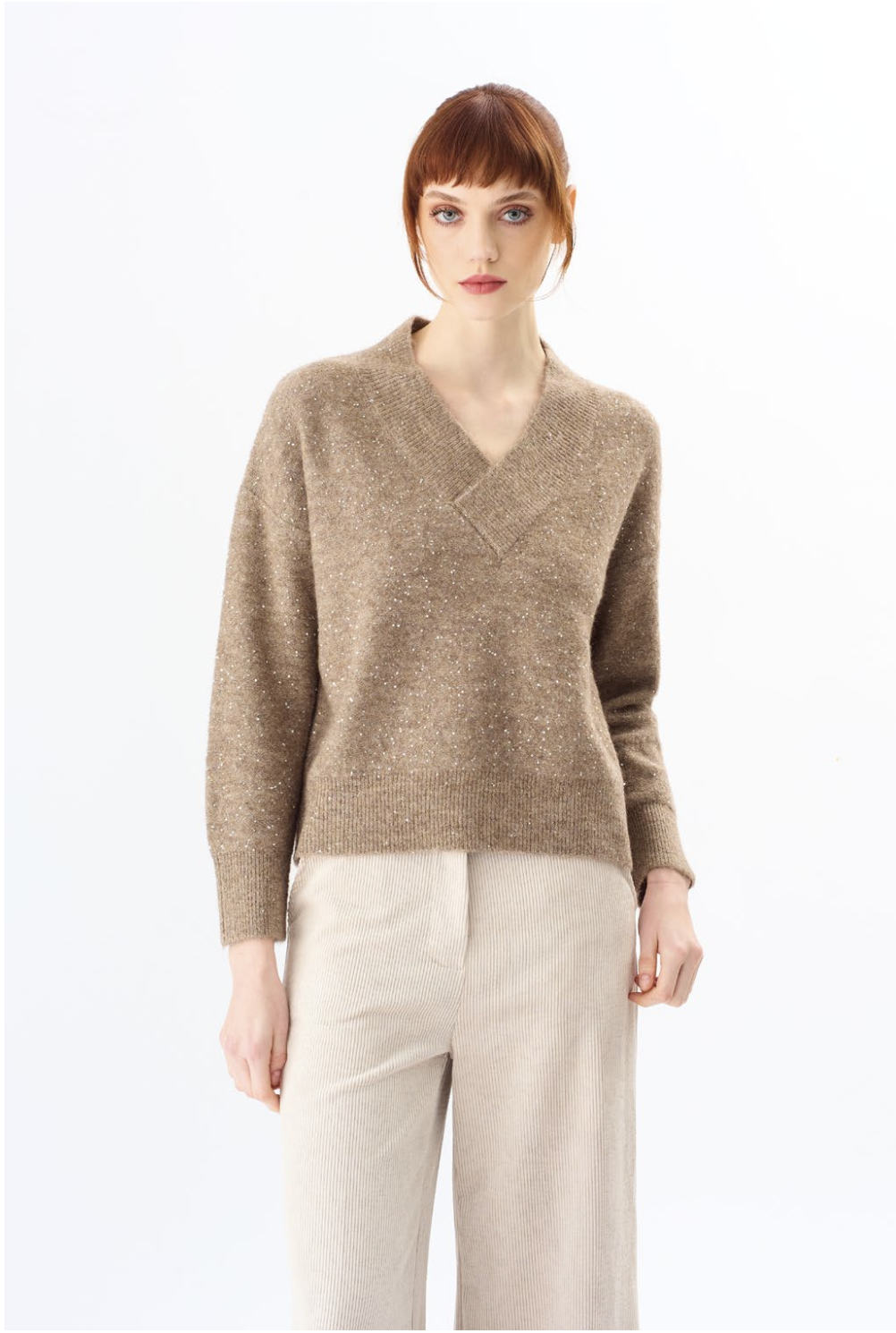 Un maglione essenziale e femminile con scollo a V incrociato, disegnata per offrire comfort quotidiano e unโeleganza discreta. La costruzione presenta maniche lunghe, spalle leggermente scese e finiture a coste su fondo e polsi per definire il volume con pulizia contemporanea. Lโeffetto melange con piccoli punti luminosi dona carattere al look, rendendola facile da abbinare dal denim ai pantaloni sartoriali.